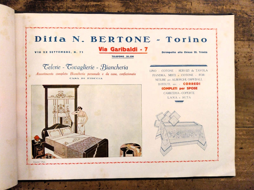 Le tavole sono eseguite in litografia a più colori. Tra le aziende storiche torinesi troviamo: articoli per la casa di Laberti in via Mazzini n° 3; cristalleria dei fratelli Prochet in via Pietro Micca n° 6; fioreria della Ditta Bocca di Ida e Olga Bourlot in piazza S. Carlo n° 10; pellicceria di Ernesto Massa in via Roma n° 20; mode per uomo di E. Parmigiani in piazza Castello n° 26; telerie della Ditta N. Bertone in via Garibaldi n° 7; mobilificio di Mario Steffenino in via Pinelli n° 3; tappezzeria della Ditta Gottardo Baruchello in via Lagrange n° 2; laneria Carlo Poggio in via Garibaldi n° 13; fotografia del Comm. Carlo Gherone in piazza Carlo Felice n° 7; guantificio Francesco Scotti in via S. Teresa n° 19; manifattura pizzi della Ditta Angelo Marelli in via Porta Palatina n° 1; distilleria G. R. Sacco di Mulassano in via Bogino n° 13, etc.