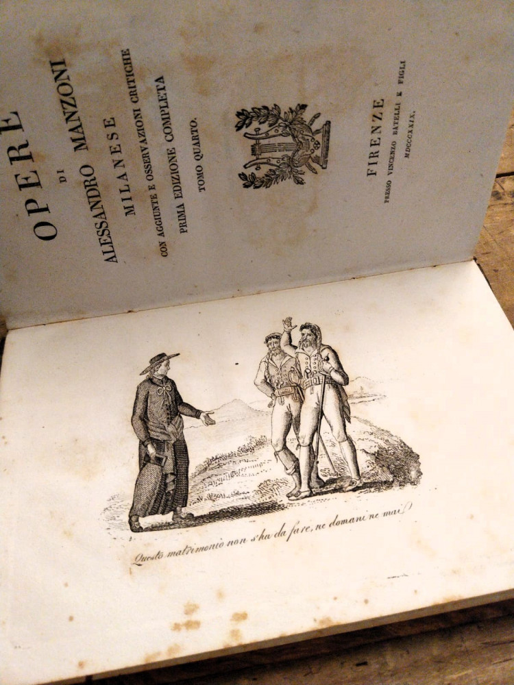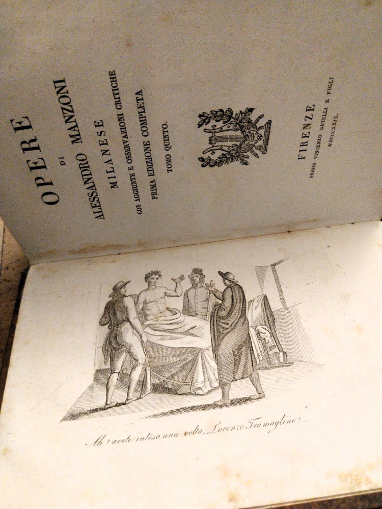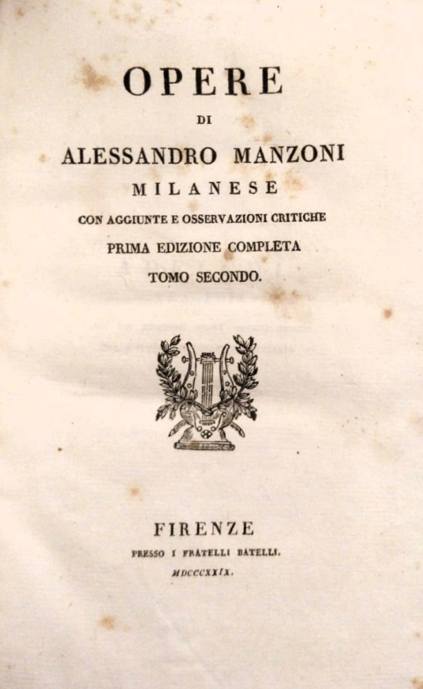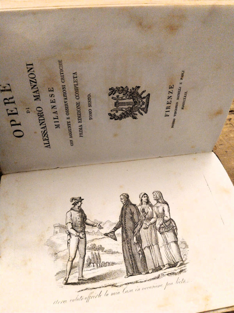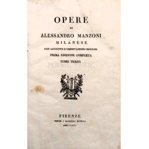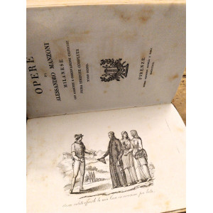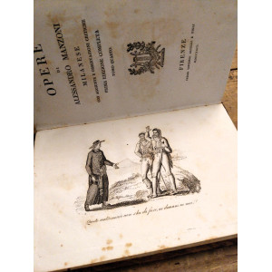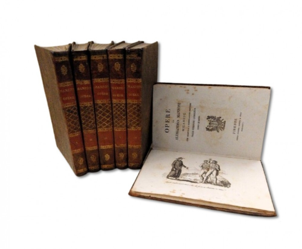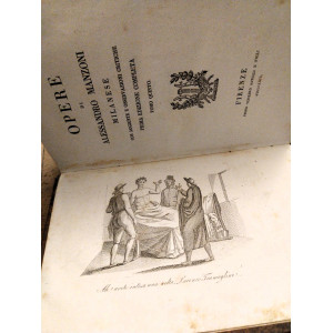 Prima rara edizione collettiva delle Opere, considerata inoltre la seconda edizione illustrata dei Promessi sposi, dopo la medesima impressa nel 1827 composta solamente dai 3 volumi del Romanzo, con le stesse tavole, che anticipa l'edizione del 1840.