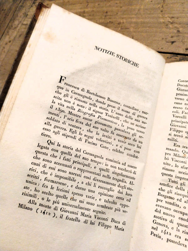 Il 1° tomo contiene: Il Discorso preliminare di N. Tommaseo; Il Conte di Carmagnola con il giudizio di Goethe (tradotto in francese da Fauriel); la lettera di Manzoni a Goethe e altri studi tra i quali la "Lettre sur l’unité de temps et de lieu dans la tragédie".