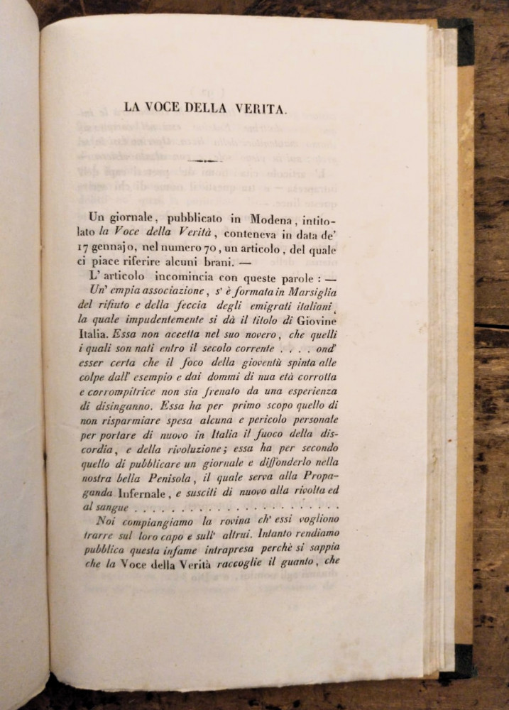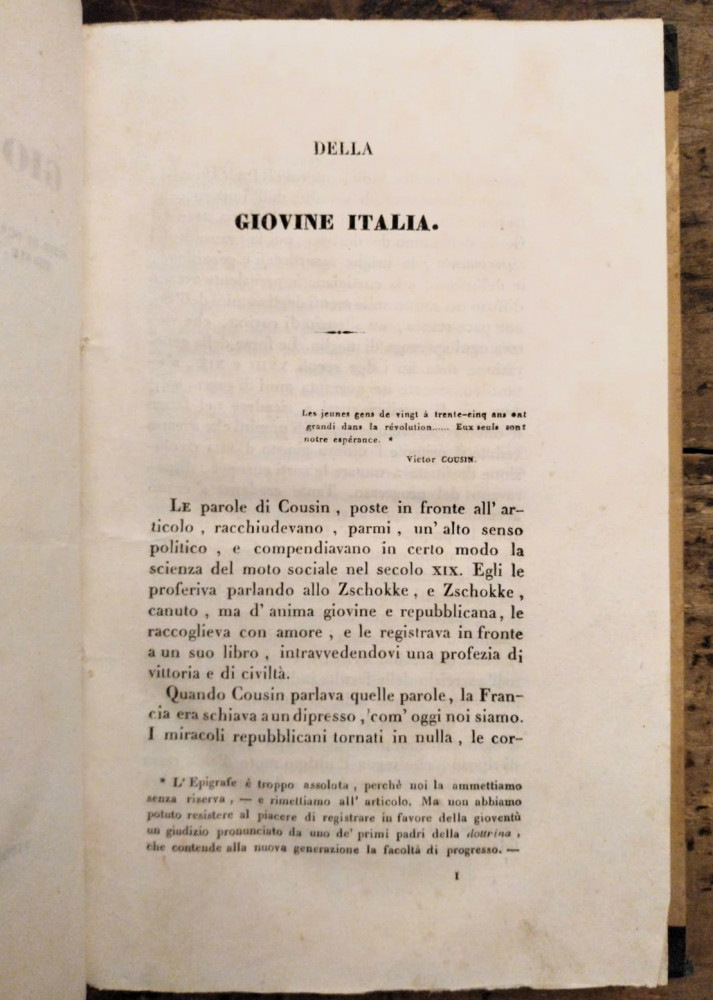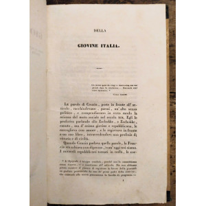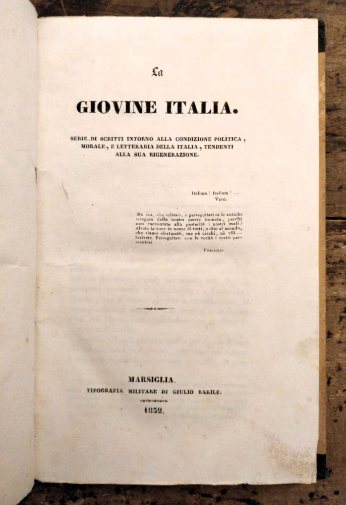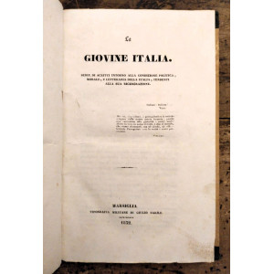 Mazzini, Giuseppe. La Giovine Italia. Serie di scritti intorno alla condizione politica, morale e letteraria dell’Italia, tendenti alla sua rigenerazione. Marsiglia, Tipografia Militare di Giulio Barile e Boulouch, 1832.