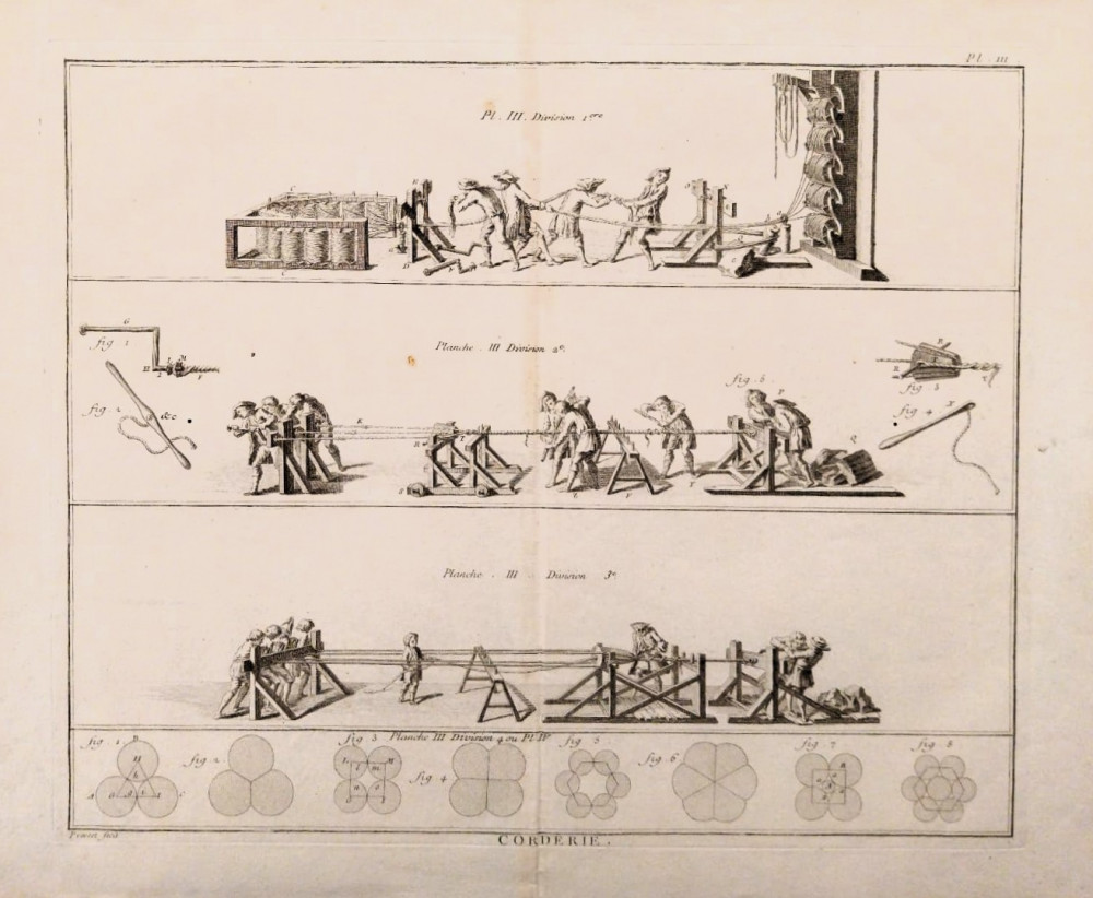 L'incisione raffigura macchine, strumenti, utensili, strutture  e dettagli utili alla realizzazione di oggetti e prodotti: in questo caso la figura del fabbricante di funi, corde o cavi (specialmente in ambito marittimo).