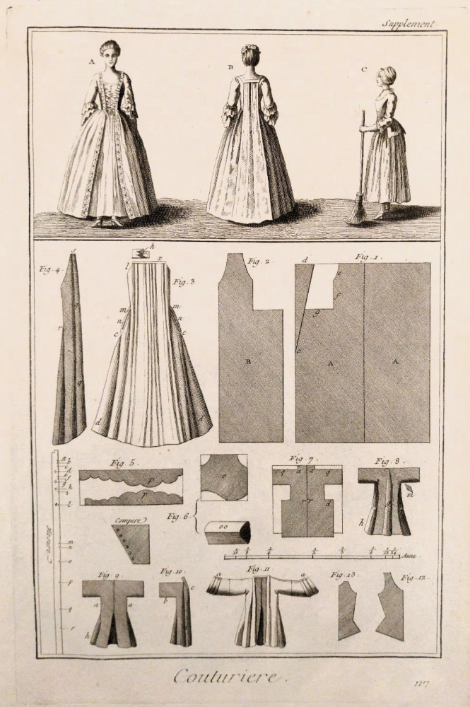 L'incisione raffigura macchine, strumenti, utensili, strutture  e dettagli utili alla realizzazione di oggetti e prodotti: in questo caso la figura della sarta che realizza abiti su misura.