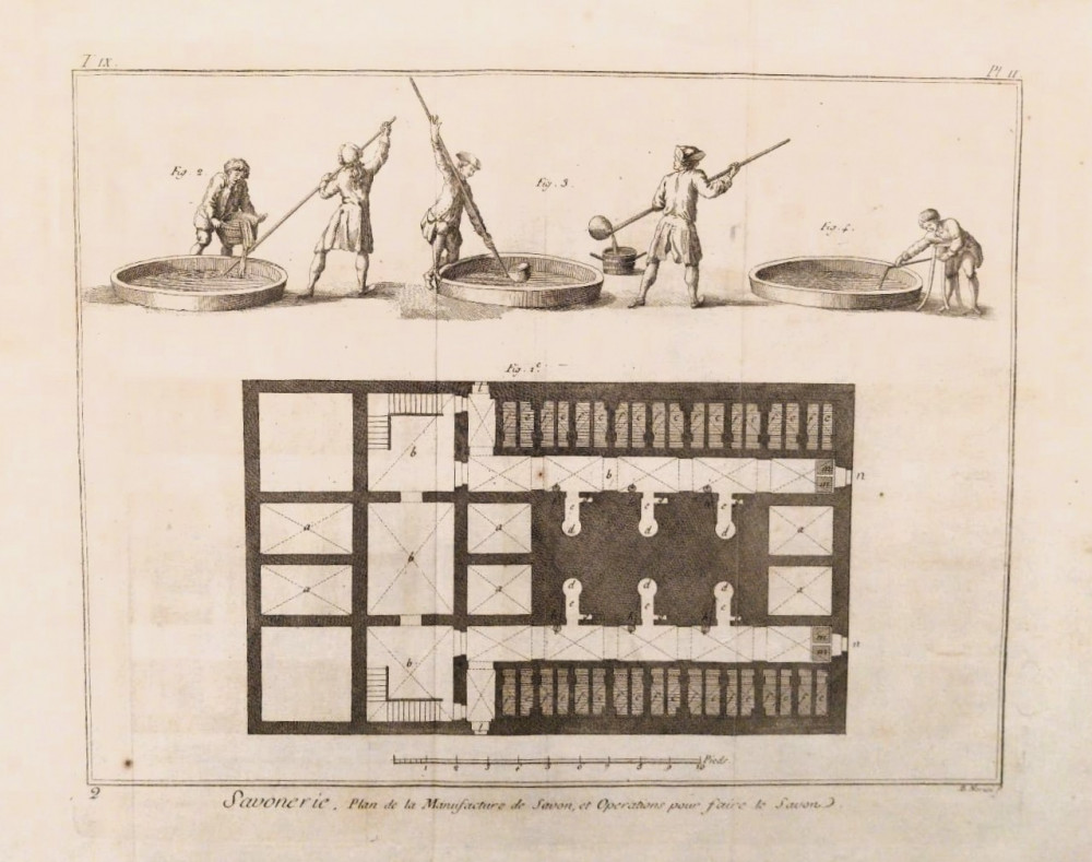 L'incisione raffigura macchine, strumenti, utensili, strutture  e dettagli utili alla realizzazione di oggetti e prodotti: in questo caso la figura del fabbricante di sapone.
