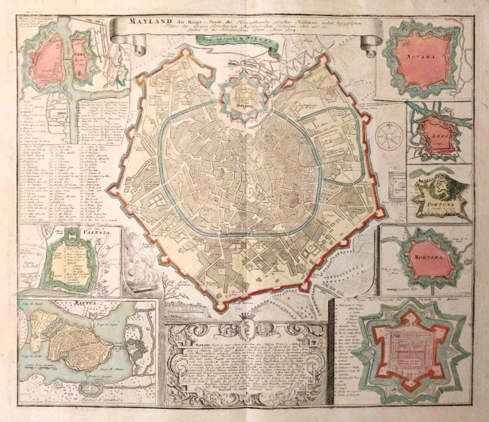 Incisione raffigurante al centro la pianta topografica della città di Milano e dell’assedio del 1733. Ai lati e in ordine da destra, la pianta di Novara, Lodi, Tortona, Mortara, il castello di Milano con annessi 21 richiami in ordine alfabetico, Mantova, Valenza e Pizzighettone con 37 richiami in ordine alfabetico e numerico.