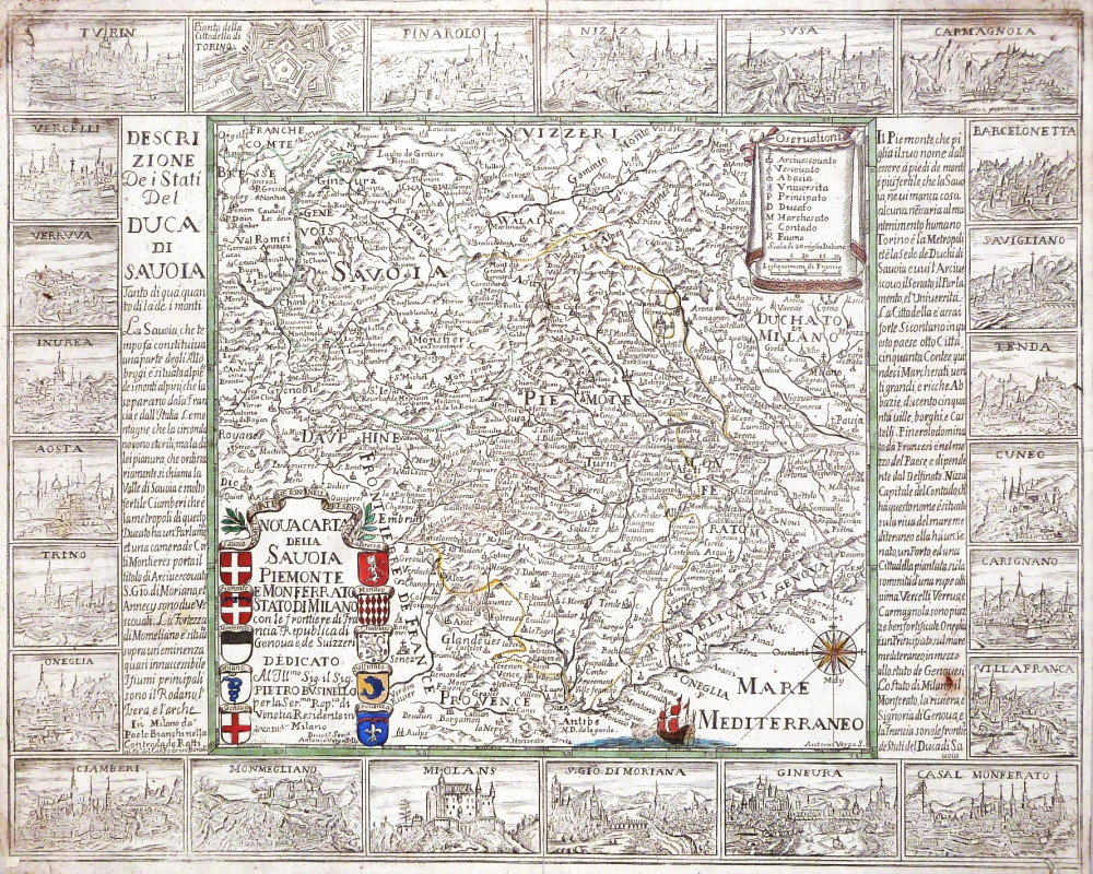 Carta geografica di estrema rarità raffigurante gli stati della Savoia, del Piemonte, del Monferrato e le zone confinanti della Francia, del ducato di Milano e di Genova e della Svizzera, contornato da ventiquattro riquadri raffiguranti le vedute di città del Piemonte e della Savoia.