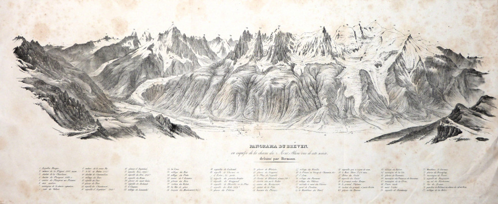 Dettagliato panorama raffigurante la catena del Monte Bianco, visto dalla cima del Brévent, montagna della Catena delle Aiguilles Rouges. Le  cime, i ghiacciai e i villaggi sono numerati e didascalizzati sotto l'immagine con settantasette richiami.