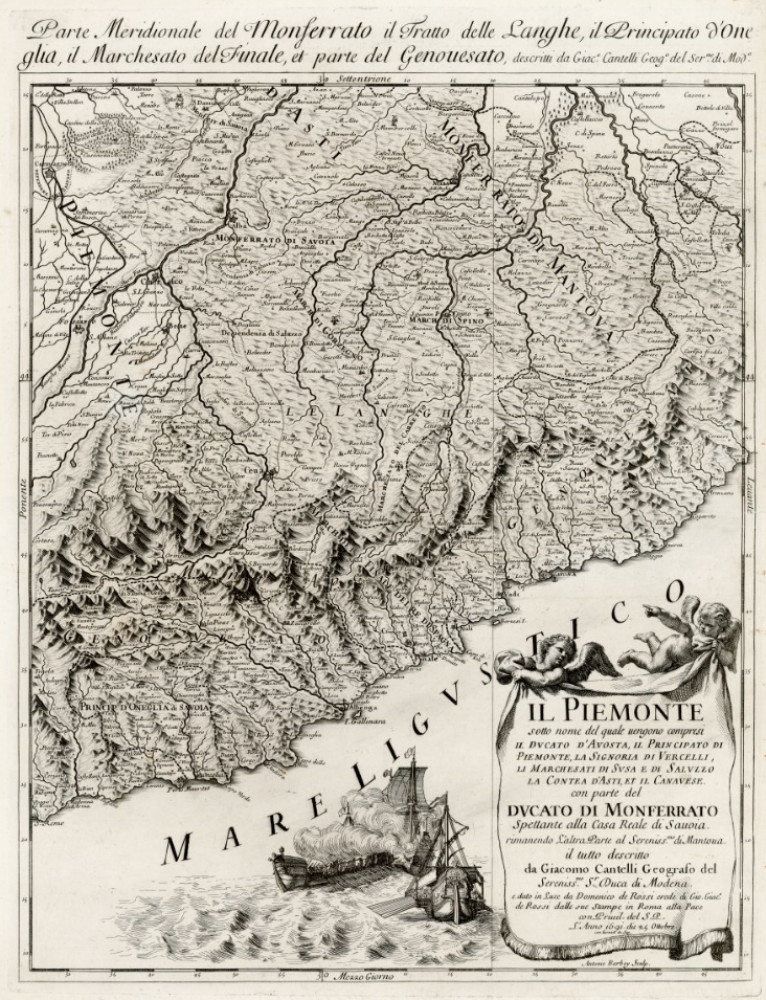 Parte meridionale del Monferrato, il tratto delle Langhe, il Principato d’Oneglia, il Marchesato del Finale, et parte del Genovesato. Roma, Domenico de Rossi, 1691.