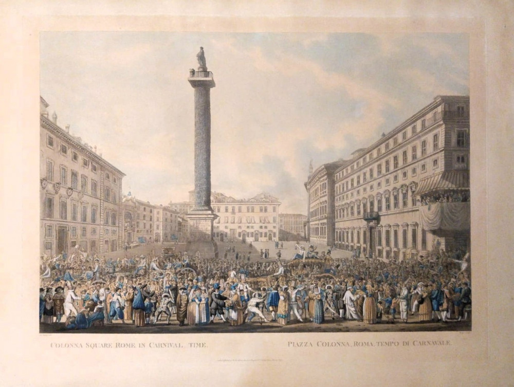 Veduta di estrema rarità raffigurante piazza Colonna a Roma con l'obelisco al centro, con una folla vestita con i costumi tradizionali del carnevale italiano in maschera: Arlecchino, Balanzone, Colombina, Gianduja, Meneghino, Pantalone, Pierrot, Pulcinella, Rugantino, Stenterello e molti altri. In primo piano molti personaggi si mescolano alle maschere e alle carrozze. A destra un balcone gremito di gente.