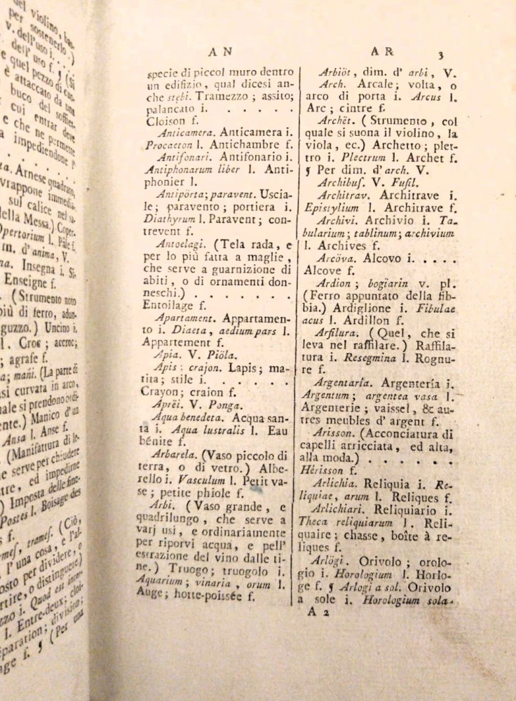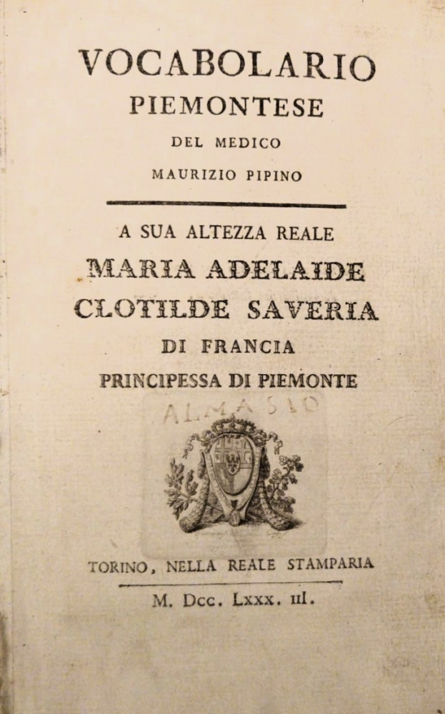 Tra i tanti vocabolari che si possono trovare nei ricchi archivi di nobili residenze che sfidano con coraggio il passar del tempo e delle genti, ne esiste uno molto particolare, il presente, edito dalla Regia Stamperia di Torino nel 1783, dal medico Maurizio Pipino.