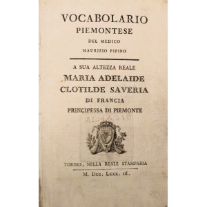 Rara prima edizione di questo fondamentale vocabolario, oggi considerato il capostipite dei dizionari dialettali piemontesi. Solo Casimiro Zalli nel 1815, dopo la restaurazione e il rientro dei Savoia, riuscì a pubblicare un lavoro considerato più completo, pur essendo Pipino riconosciuto come il primo autore del "Vocabolario Piemontese".