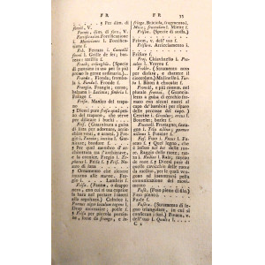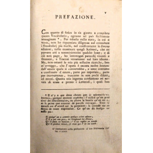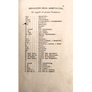 Frontespizio con firma di appartenenza sullo stemma calcografico della dedicataria, Maria Adelaide Clotilde Saveria di Francia Principessa di Piemonte, prefazione, spiegazione delle abbreviazioni, testo disposto su due colonne, in fine errori e mancanze occorse nella stampa, aggiunta al vocabolario domestico, raccolta dei verbi più familiari e supplemento.
