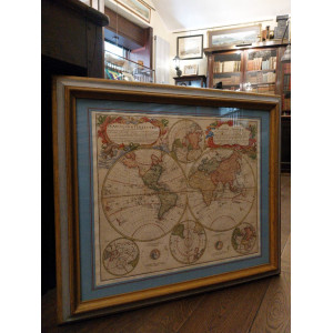 Raro e dettagliato doppio planisfero terrestre, che rispecchia le conoscenze della metà del secolo, rimanendo incerto solo in quelle aree più remote del Pacifico prossime ad essere esplorate dal Capitano Cook. La mappa fu compilata da Johann Matthias Hasius, professore di scienze matematiche alla Università  di Wittenberg ed incluse le osservazioni geografiche ed atronomiche di George Moritz Lowitz.