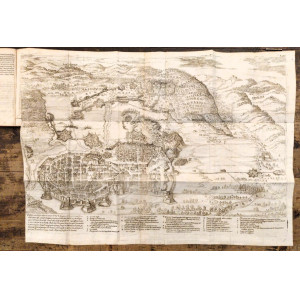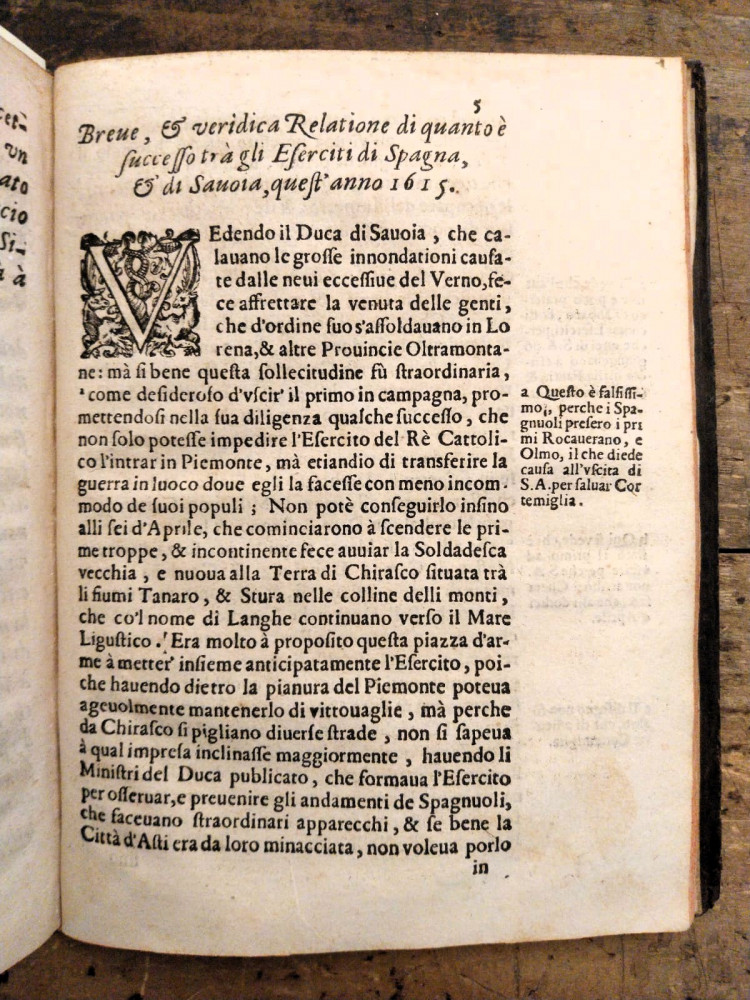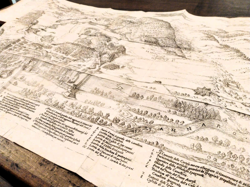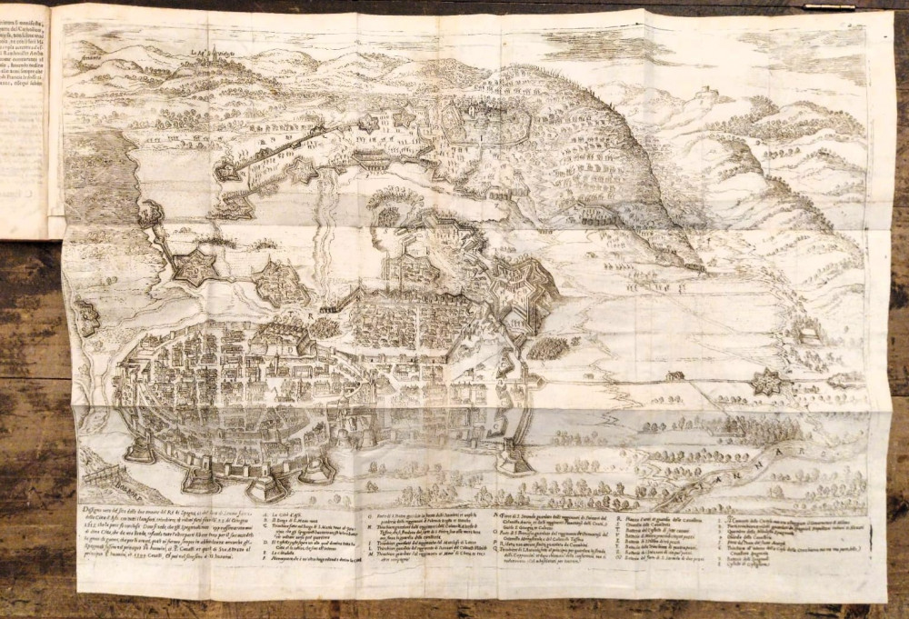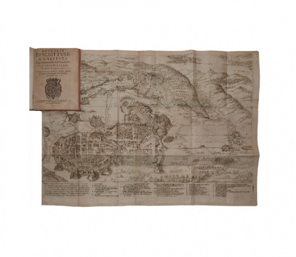 Frontespizio con fregio tipografico, 1 grande e rara pianta anonima dell’assedio di Asti; lungo il lato inferiore il titolo disposto su sete righe, segue una legenda su cinque colonne, con 31 richiami. La veduta prospettica raffigura la città di Asti assediata dalle truppe del marchese della Hynoyosa nel maggio del ’15. In questa incisione Asti appare in tutta la sua completezza, esclusa la cittadella sabauda non ancora costruita. Ben visibile tutto il sistema di fortificazioni, dal Monte Rainero al forte di San Pietro. Sullo sfondo, a sinistra, la chiesa della Madonna di Viatosto, a metà la Certosa e a destra il castello di Castiglione occupato dagli Spagnoli.