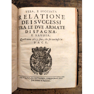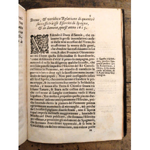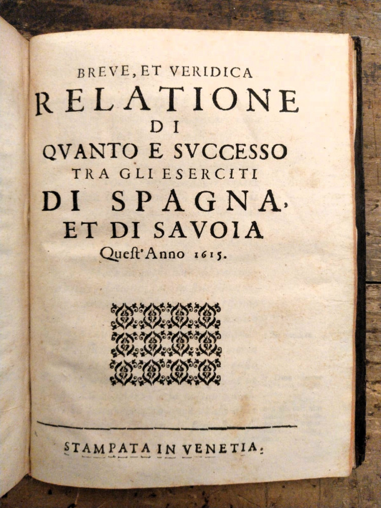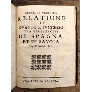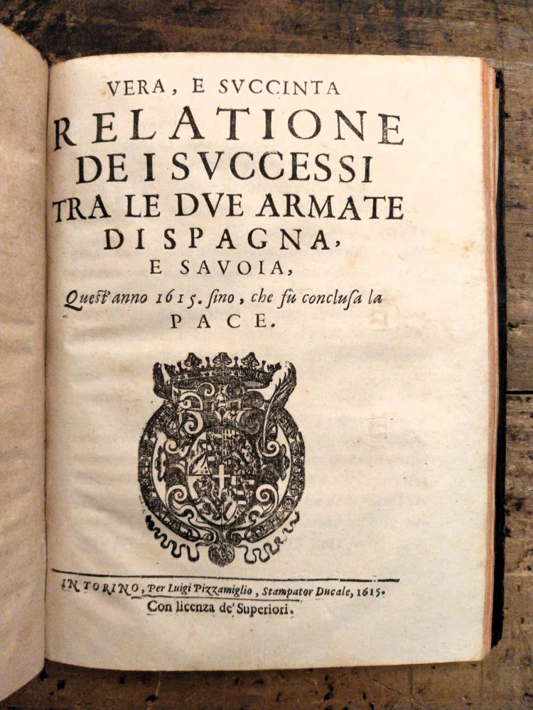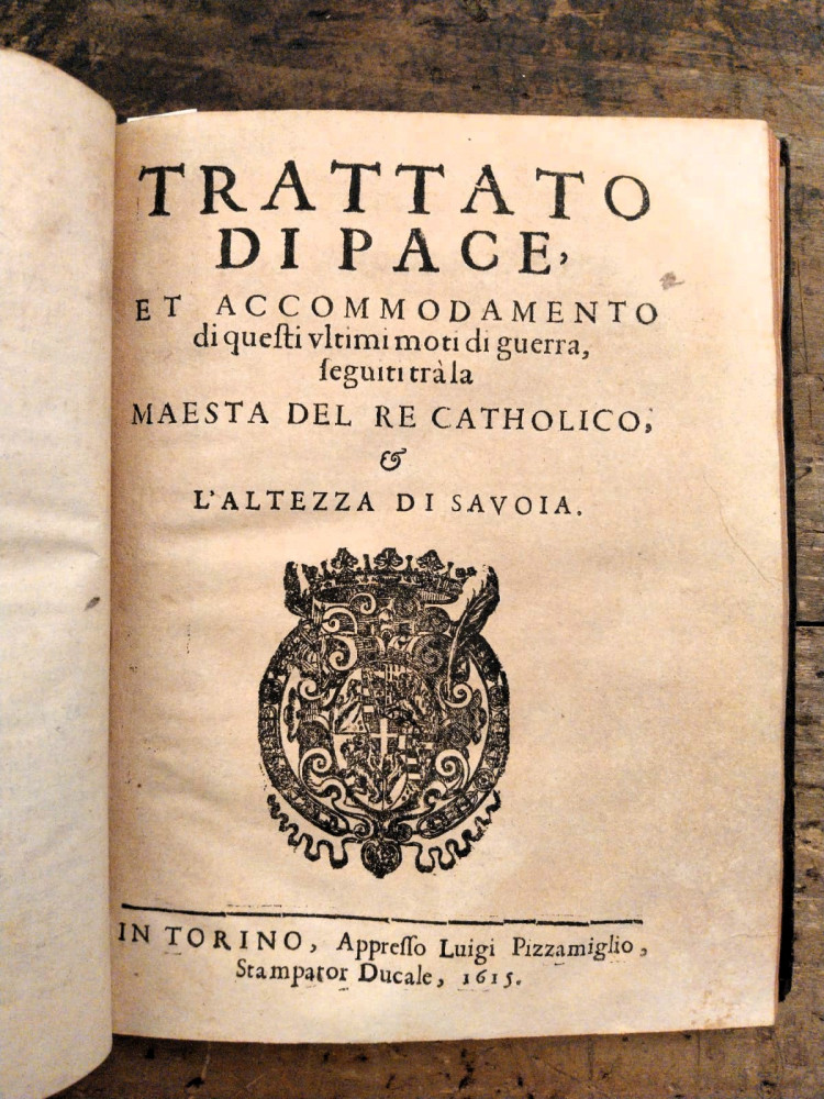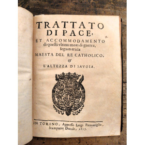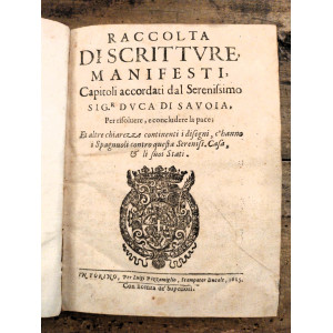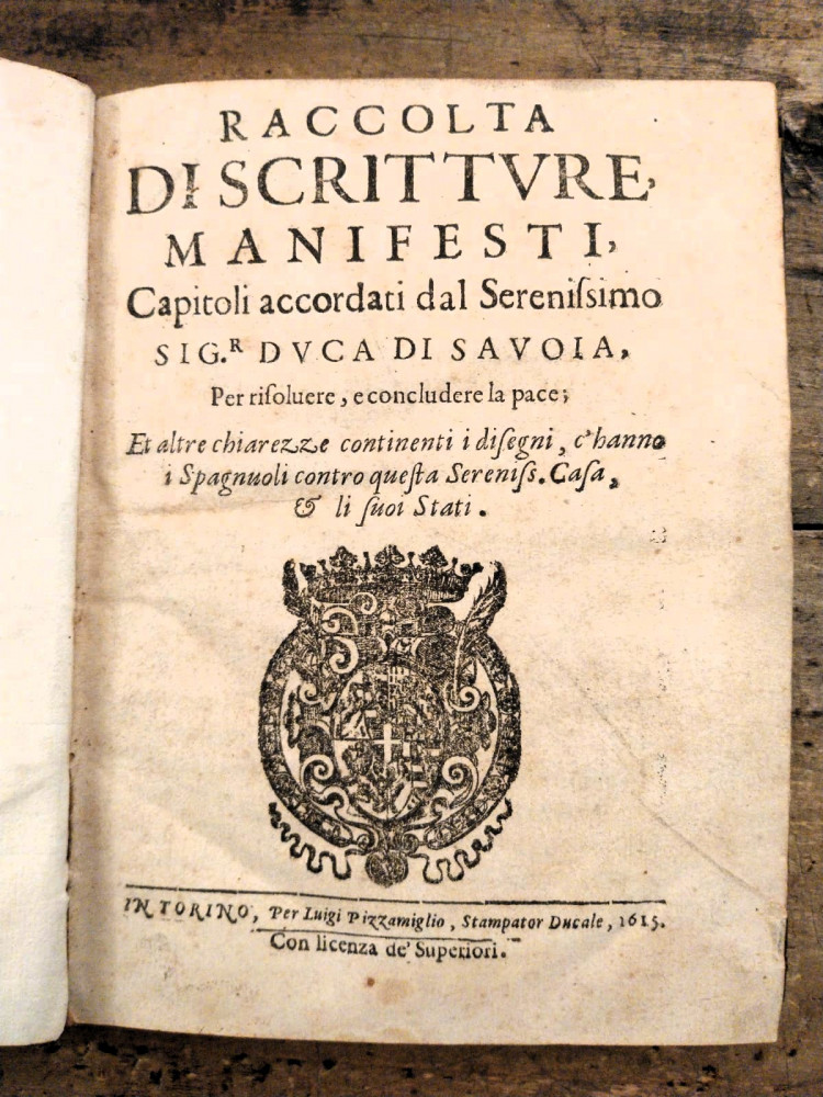 Raccolta di scritture, manifesti, capitoli accordati dal Serenissimo Sig.ͬ Duca di Savoia. Torino, Luigi Pizzamiglio, 1615, legato con Trattato di pace [...], legato con Breve, et veridica relatione [...]. Venezia, s.t., s.d. [...].