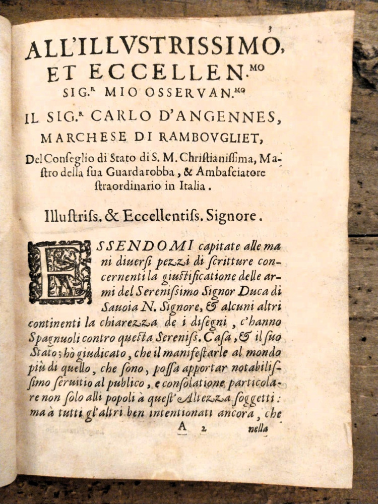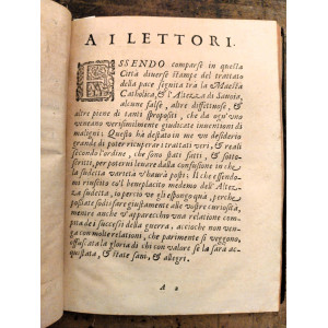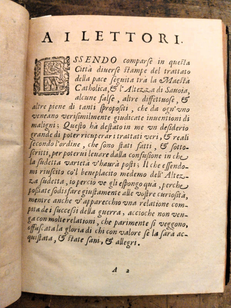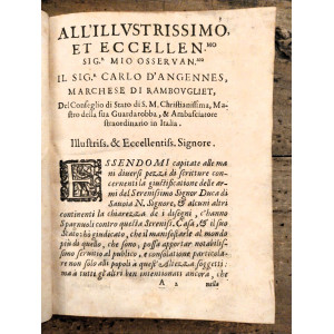 Frontespizio con stemma dei Savoia, capilettera istoriati, dedica ai lettori.