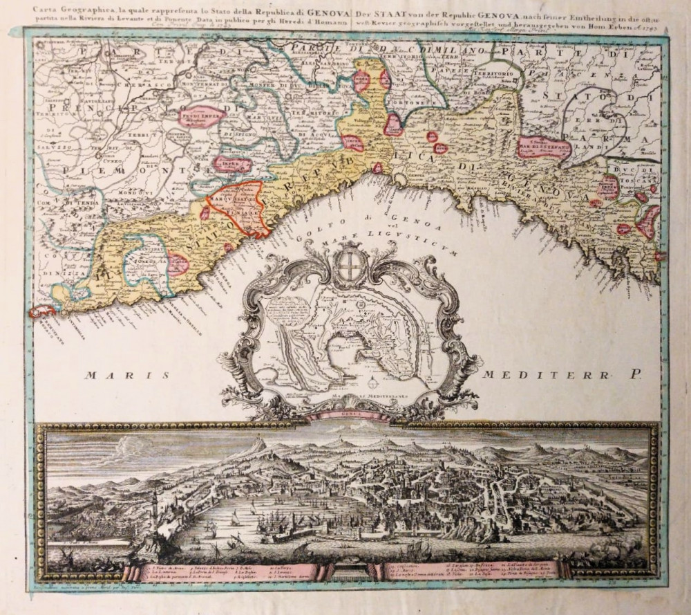 Carta geographica la quale rappresenta lo Stato della Repubblica di Genova. Norimberga, eredi Homann, 1734.