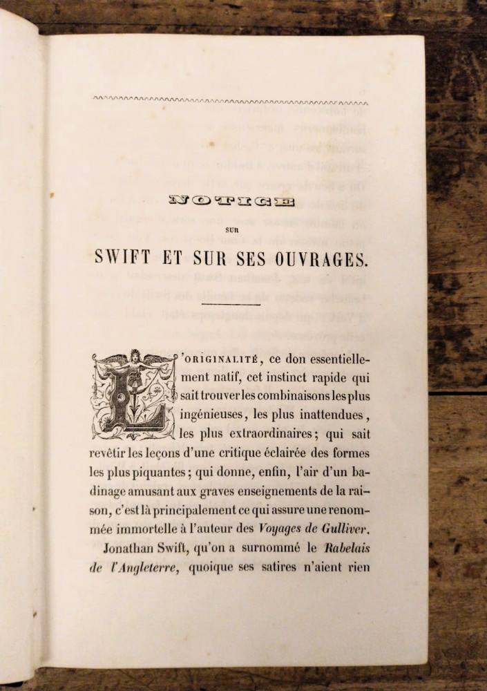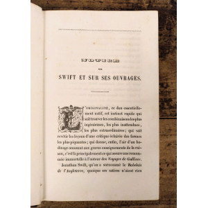 Occhietto, frontespizio con fregio tipografico, testo in francese, capilettera istoriati, testatine e finalini, notizie relative a Jonathan Swift, 20 tavole fuori testo su disegni di Bouchot, incise su rame da Brugnot, Chevin, Trichon, Pouget e Budzilowicz, accompagnate da didascalie esplicative sottostanti, in fine esteso indice.