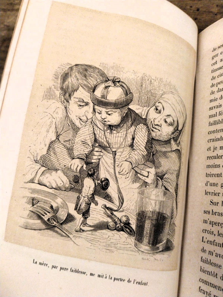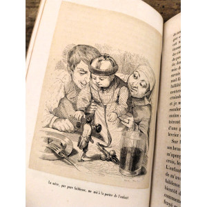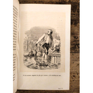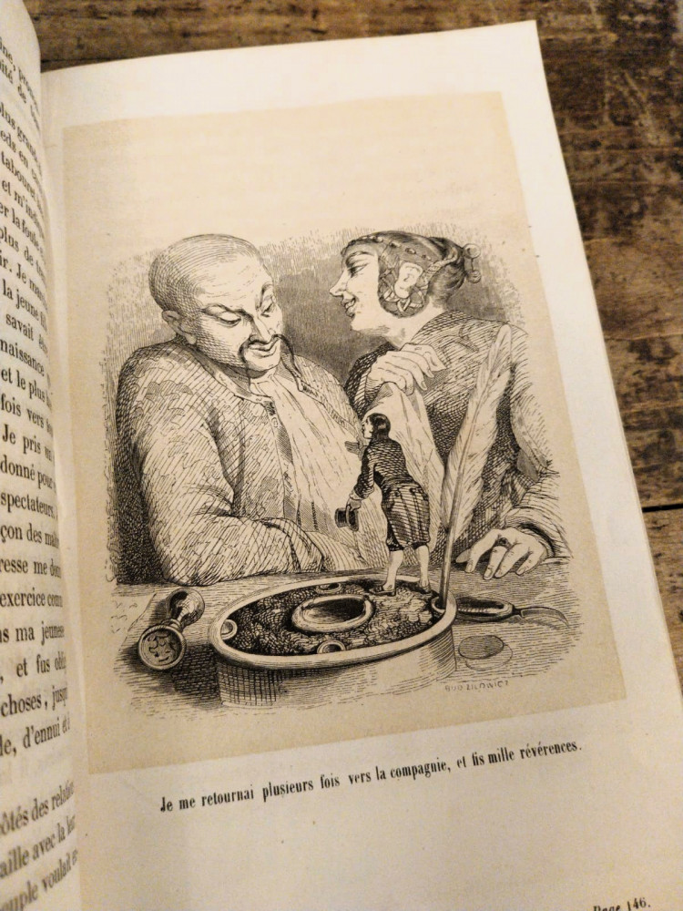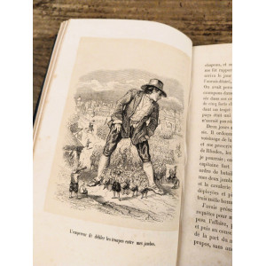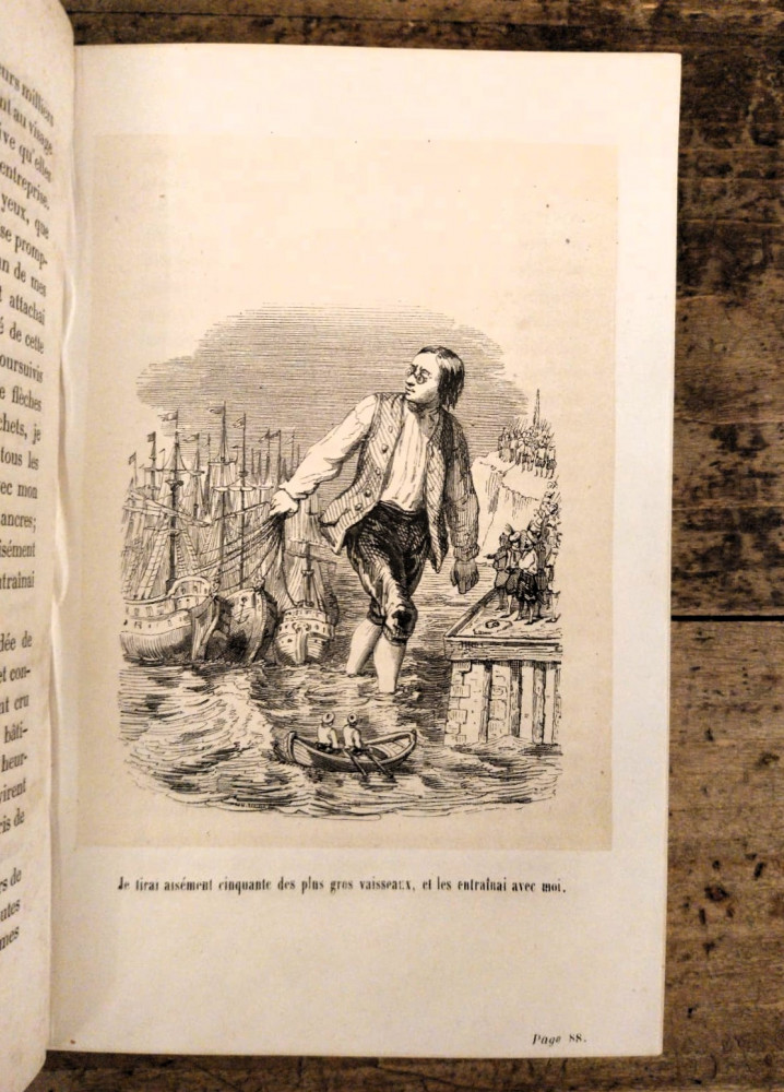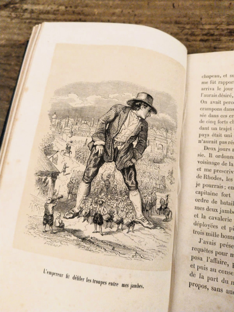 Nuova impressione, corretta e rivista sotto l'approvazione dell'Abate Lejeune, del romanzo fantastico di Jonathan Swift sulle avventure di Lemuel Gulliver a Lilliput, illustrata dal disegnatore, illustratore, litografo e caricaturista francese Frederic Bouchot (*1798-†1860).