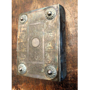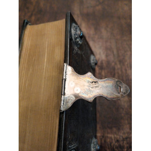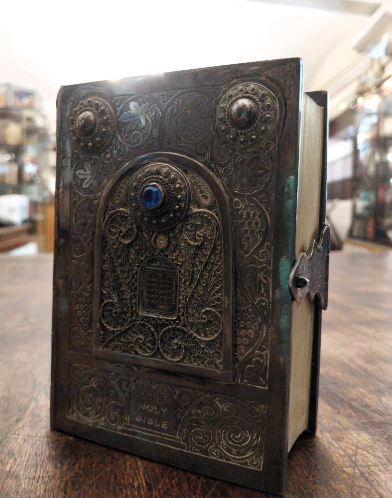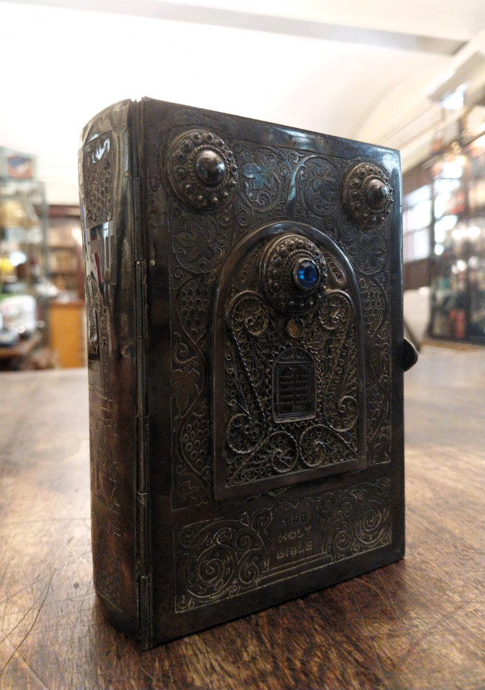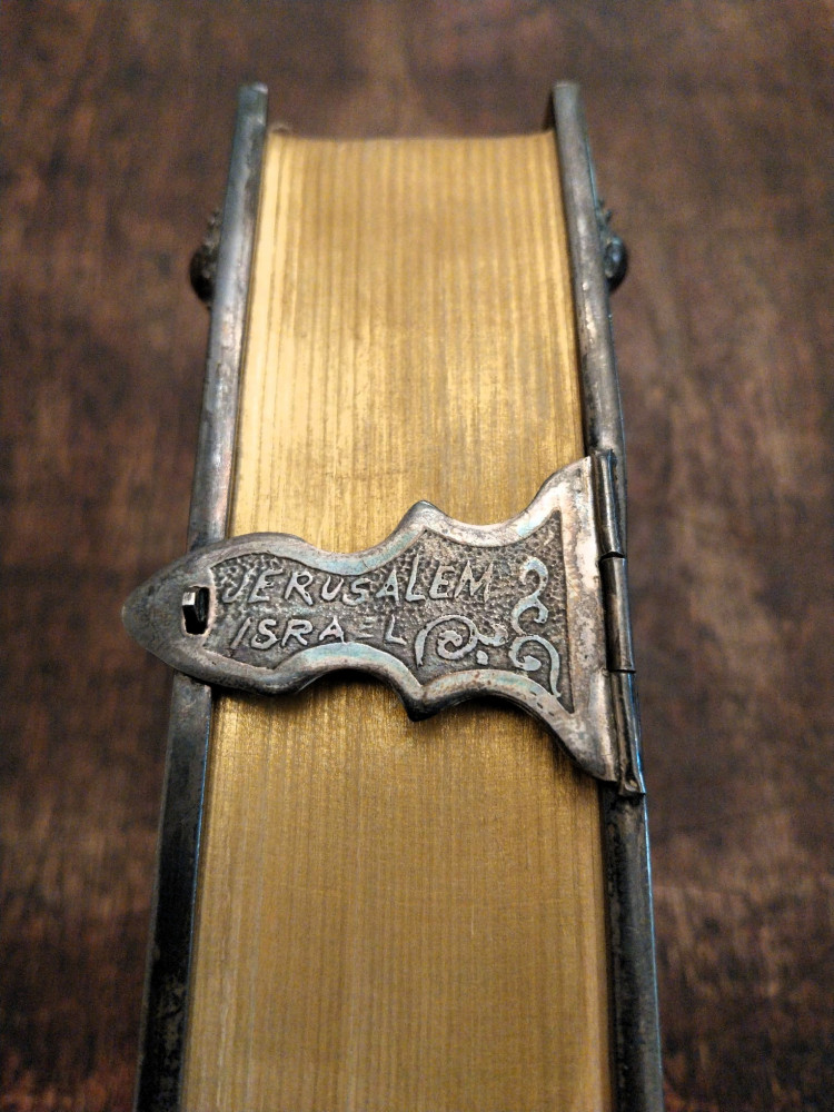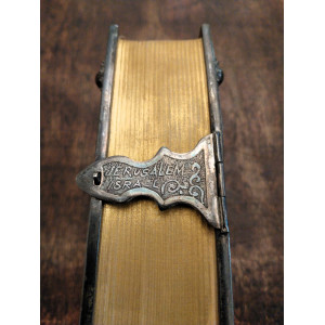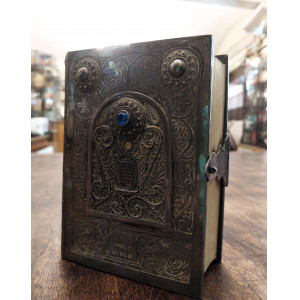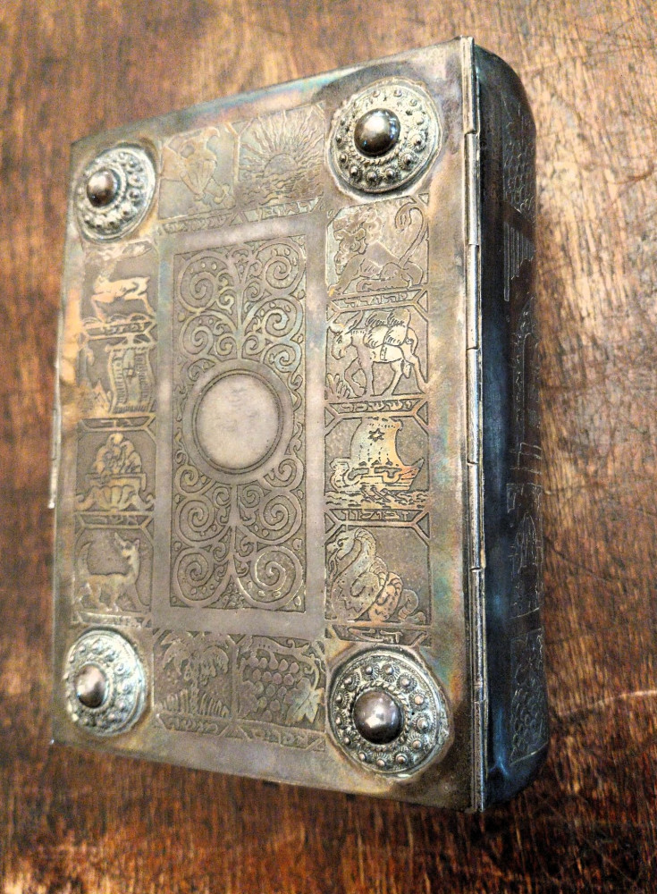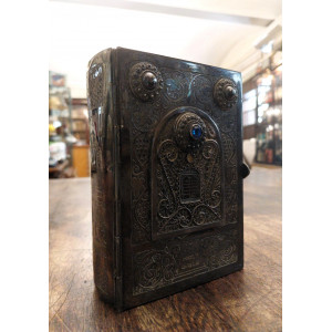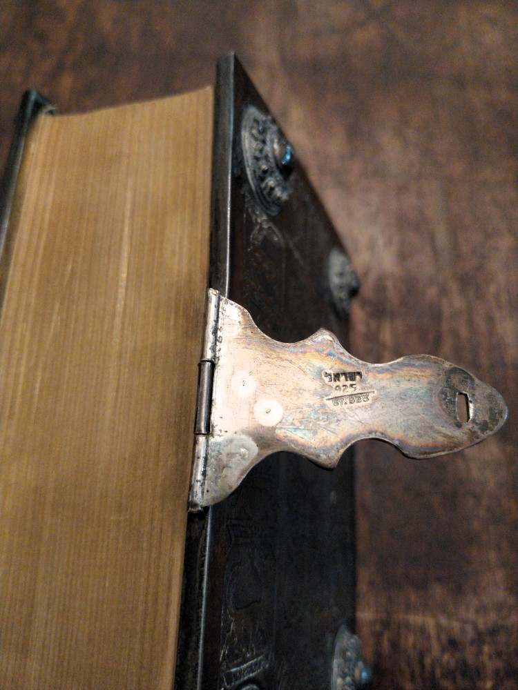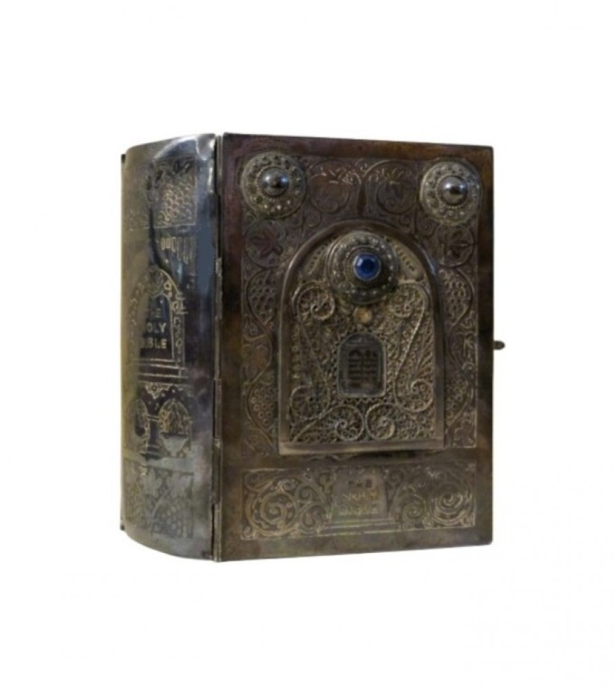 Bibbia ebraica degli sposi in bella e preziosa veste: argento cesellato, al piatto anteriore tavole della Torà racchiuse in un groviglio delicato di fili che circondano a loro volta un rialzo contenente una pietra blu incastonata, attorno foglie di vite che si estendono fino al dorso, al verso i simboli delle Dodici Tribù di Israele e fermaglio integro con la scritta "Jerusalem Israel".