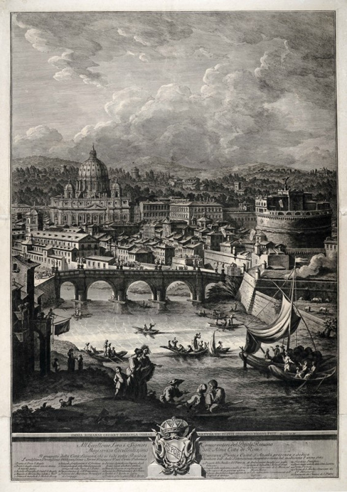 Rara e monumentale veduta raffigurante la Basilica Vaticana, Castel Sant'Angelo con il Ponte e gli edifici facenti parte della Spina di Borgo, distrutti nei primi anni del Novecento per costruire la via della Conciliazione. In primo piano, nella metà inferiore dell'esecuzione, sono raffigurate scene di vita lungo il fiume Tevere con barche e personaggi. Nella parte superiore, sullo sfondo, la città è densamente costruita, sotto un cielo solcato da nuvole.