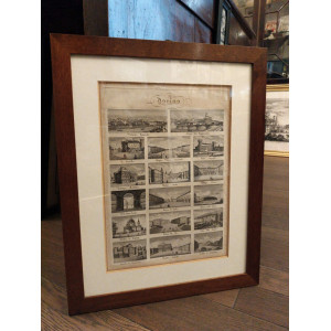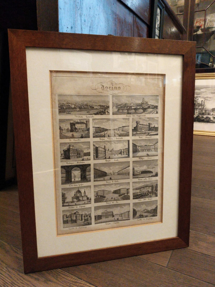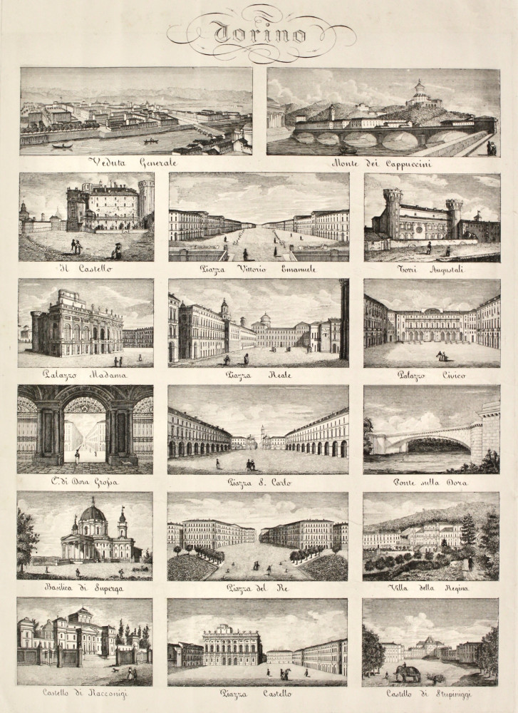 Lungo il lato superiore centrale il titolo, seguono diciassette vedute: veduta generale della città presa dal Monte dei Cappuccini; veduta prospettica del ponte Vittorio Emanuele I con il Monte dei Cappuccini e la chiesa della Gran Madre di Dio; veduta di Palazzo Madama dal lato prospiciente l'attuale via Roma; piazza Vittorio Veneto presa dalla chiesa della Gran Madre di Dio; veduta del palazzo detto delle Torri Palatine; Palazzo Madama preso dalla piazzetta Reale; piazza Castello con lo sfondo del Palazzo Reale; veduta del Palazzo municipale con la piazza antistante; insolita veduta dell'attuale via Garibaldi presa dall'atrio di Palazzo Madama; pizza San Carlo con le due chiese di Santa Cristina e San Carlo; il ponte Mosca; veduta della basilica di Superga; piazza Carlo Felice; veduta prospettica della Villa della Regina; il Castello di Racconigi; piazza Castello con il Palazzo Madama dal lato prospiciente l'attuale via Garibaldi e veduta della palazzina di Stupinigi con l'elefante in primo piano.