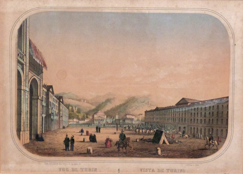 Rara e suggestiva veduta prospettica di piazza Vittorio Emanuele (ora piazza Vittorio Veneto), vista da via Po. Sullo sfondo la chiesa della Gran Madre di Dio, la collina con la Villa della Regina.