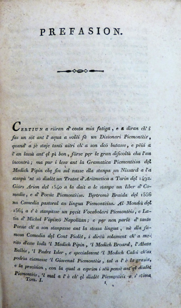 Zalli, Casimiro. Disionari piemontèis, italian, latin et fransèis conpöst dal preive Casimiro Zalli d’ Cher. Carmagnola, da la Stanparia d’Peder Barbiè [Pietro Barbiè], 1815.